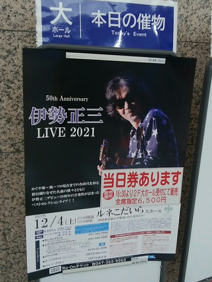良いよ、良いよ、、と半泣きでメモがとってある。この最後の最後に『なごり雪』はとても嬉しかった。楽しいのにさびしそうになる、そんなライブの終わりのなごり雪。小平の街にも合っていたし、70年代を少し感じる小さな駅と駅前の感じ、このホール。今日のライブのまとめにピッタリの大団円だった。Shoyanの声もよく出ているし、かつしかよりずっとパワフルになった~♪と書いてある。入れ込み過ぎて天にシャープしそうなヴォーカルもたまらず、D45のソロフレーズの音も老成の50年の円熟を感じる。こんな豊かで確かで純粋な愛の気持ちになったのってどれくらいぶりだろう、とホントにホントに泣けてきた。心の底から「正やん、今日も歌っていてくれてアリガトウ」とギュッとした気持ちで手を叩いた。