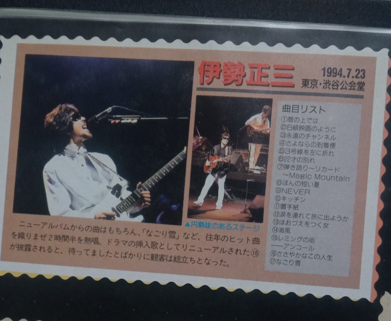 ※再度恐縮ですが、先の歌詞表示に続いて、スクリーンに映しだされるイメージフォトのスライドもネットのフリー素材から拾ってきたような雰囲気を感じてしまう。これは『THE伊勢正三』のブックレットでも思ったのだけど、歌が含んでいるイメージというものはとても繊細で、人それぞれに深い思い入れがあるものだから安易な引用は逆効果になる恐れありと思うのです。 (ウルサイな~ワタシも^^;)でも、やはり演出の方が一生懸命セッティングした意味のあるフォトたちかもしれないし、勝手な意見でゴメンナサイ。