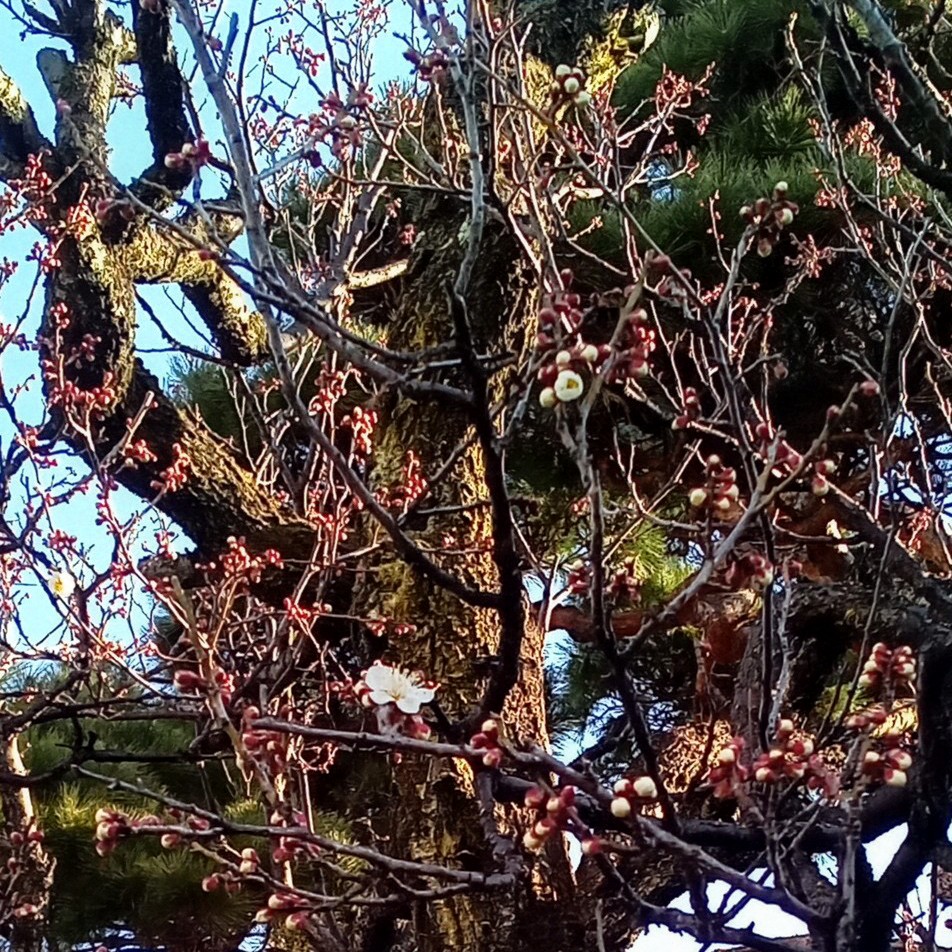 ☆下がり梅ではありませんが、やっと梅の一番花が咲きました。スノードロップも咲き揃ってきました。